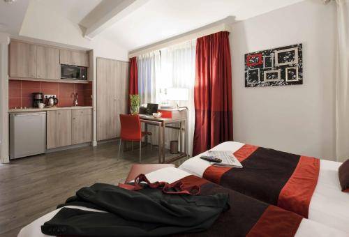 Eighty-nine apartments, comprised of one-bedrooms and studios, are soundproof and feature satellite TV and a fully equipped kitchen with tea and coffee making facilities. Rooms are also equipped with an iron, safe, telephone, writing desk and seating area. Free Internet access is available throughout the apartments.