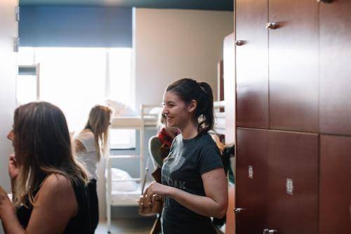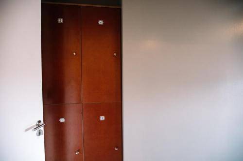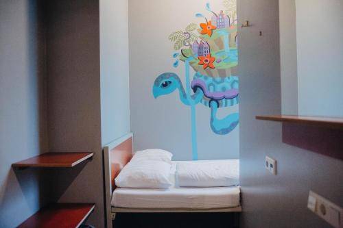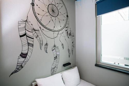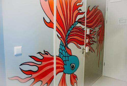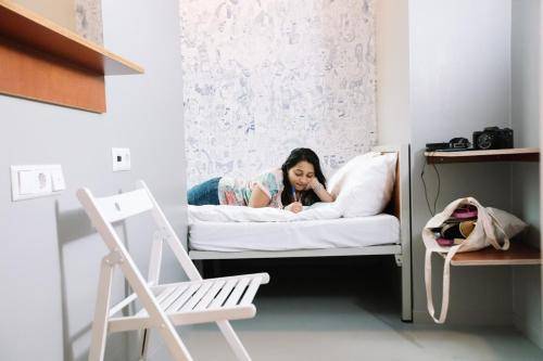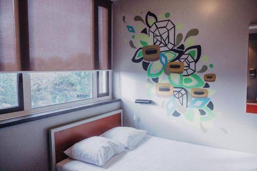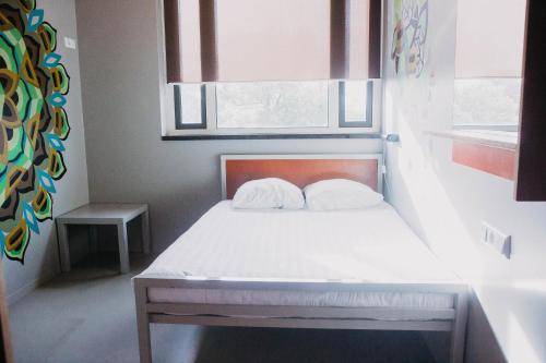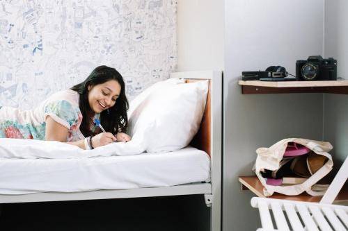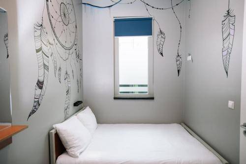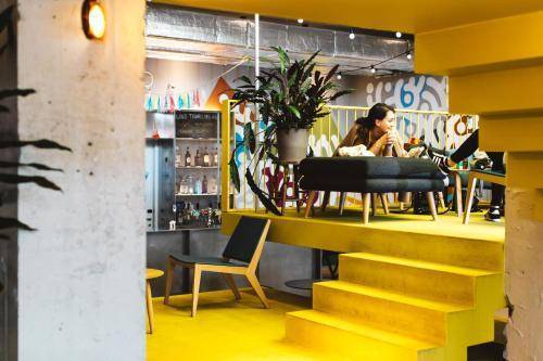 Private rooms are just as streamlined as the shared rooms, with white and wood bed frames. All rooms are rather small but brightened with interesting wall murals. Wi-Fi is free.