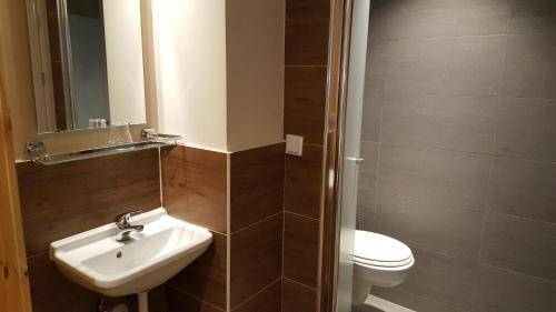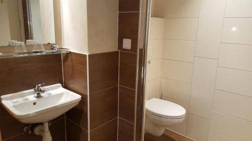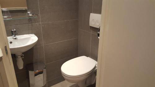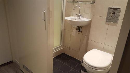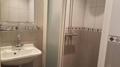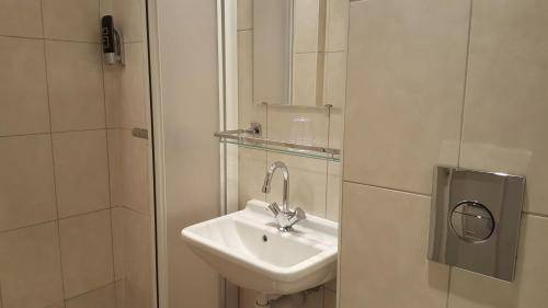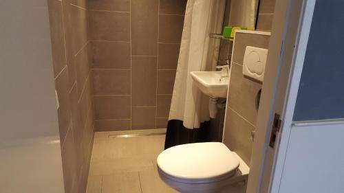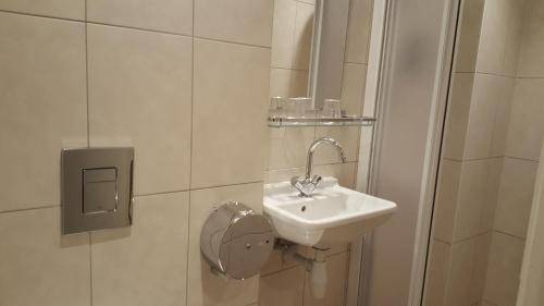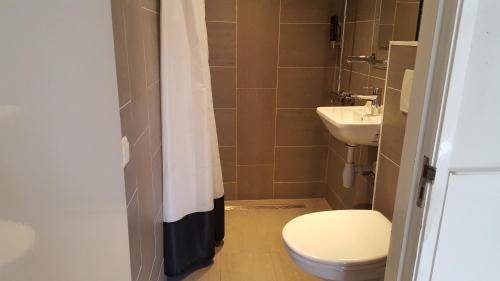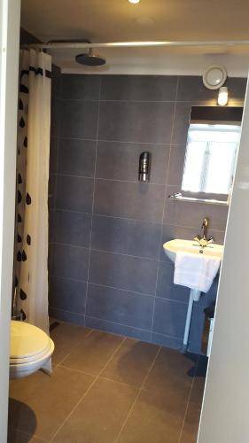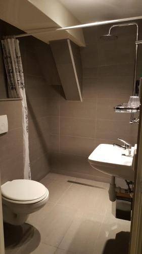 Bathrooms are either private or shared and all feature showers (no tubs). Hair dryers are available at reception. The terrazzo floor makes it feel a bit dated, but the white tile walls and accessories are quite clean.