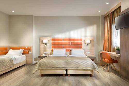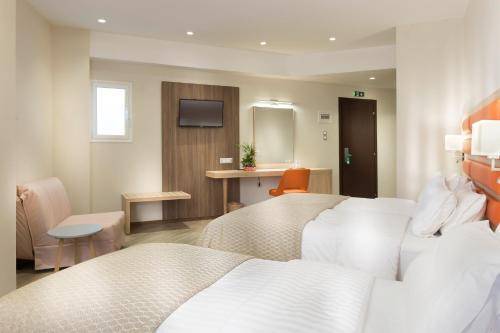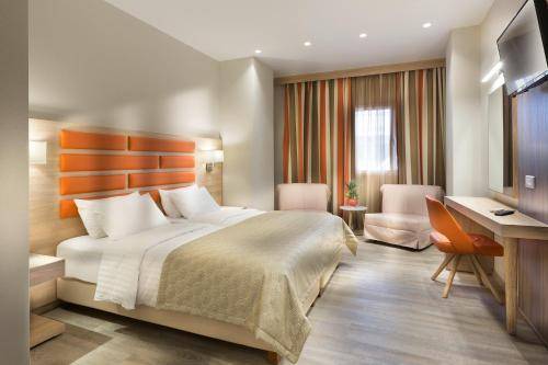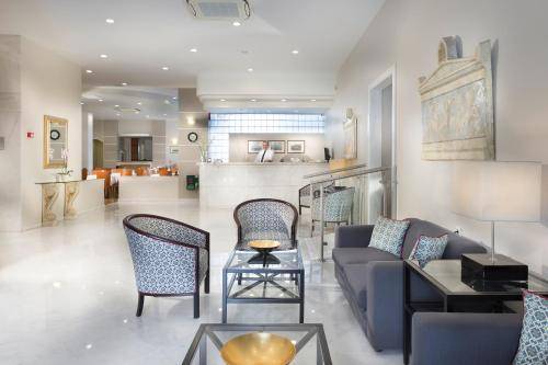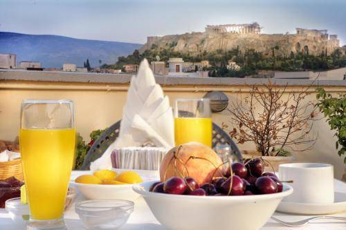 Bedrooms have the familiar set-up of a mid-range hotel, including bed units with attached desks. All the rooms are equipped with air conditioning, telephones, and satellite television. Pricier Acropolis-facing rooms have fantastic views, albeit from tiny balconies.