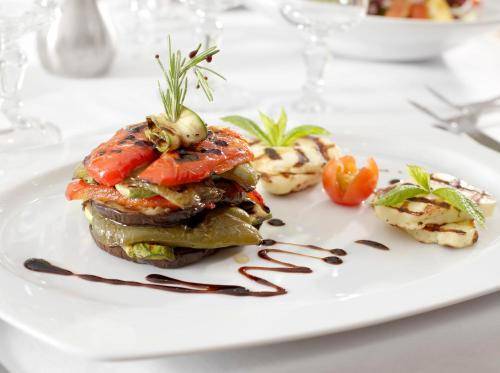 The bedrooms are bright and welcoming with white, black, and gray color schemes and modern furnishings. They are all equipped with air conditioning, satellite television, and a hookup for Internet. En suite bathrooms are white and beige, with some gray marbling through the sink's surrounding countertop.