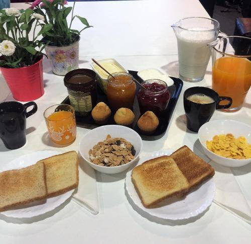 Breakfast, included in the room rate, is served buffet-style and consists of toast, cereal, juice, tea, and pastries. Guests are required to do their own dishes after breakfast or any other meal, so it’s not surprising that we spotted a few lone cereal bowls in the communal kitchen (the only room in the hostel where we saw anything out of place).