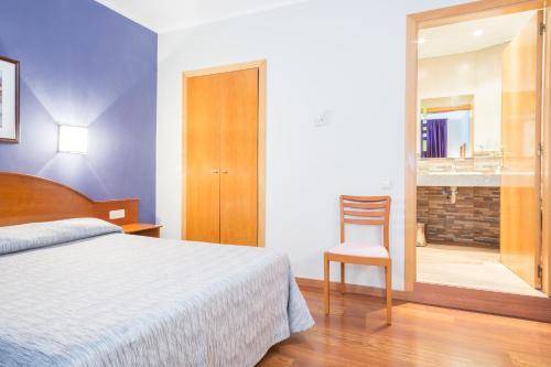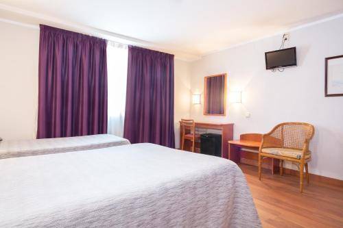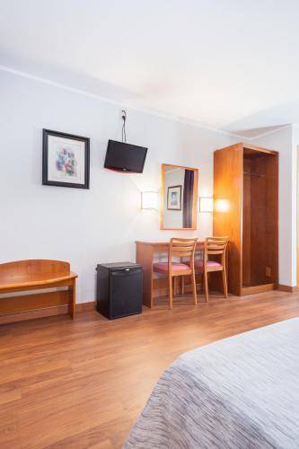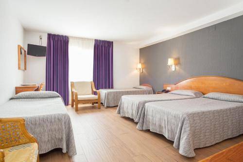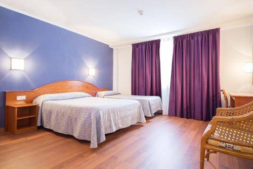 Rooms at the Cortes are clean and spacious. Renovations replaced colorful accent walls of bright turquoise or grape purple and peach-colored curtains with modern decor in shades of gray. Some rooms offer views of a lovely interior courtyard. The decoration is sparse, with nothing more than the occasional canvas of mountains or birds.