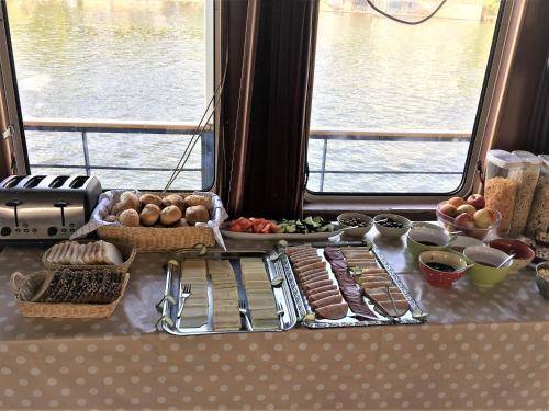 On the main deck, carpeted “first-class” single and double cabins are the “poshest” option, which translates to two large windows, a wardrobe and a bit of extra space. A TV and minibar can be provided upon request. Private “second-class” cabins are located on the lower deck. They sleep one to four guests and are compact, with cute porthole windows.