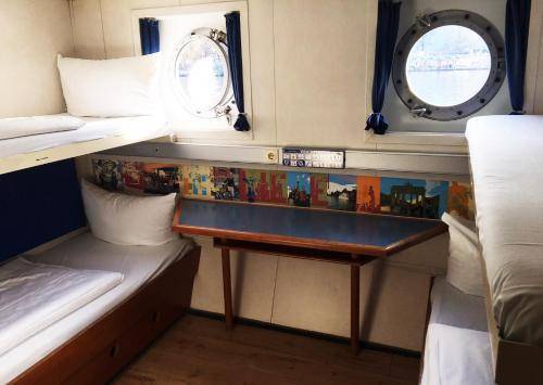 The cheapest sleeps are on the upper deck, where two plain “third-class” dorms fit up to six skippers each, sardine-style. These have large windows, lockers and little else. Come summer, there’s an even cheaper option: You can set up a tent on the upper deck.