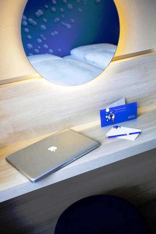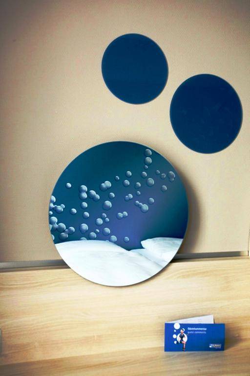 Rooms are equipped with modern conveniences (flat-screen TV, air conditioning, Wi-Fi) and private bathrooms. A "bubble"-themed piece of art doubles as a headboard and makes a quirky contribution to the H2 hotel's water theme.