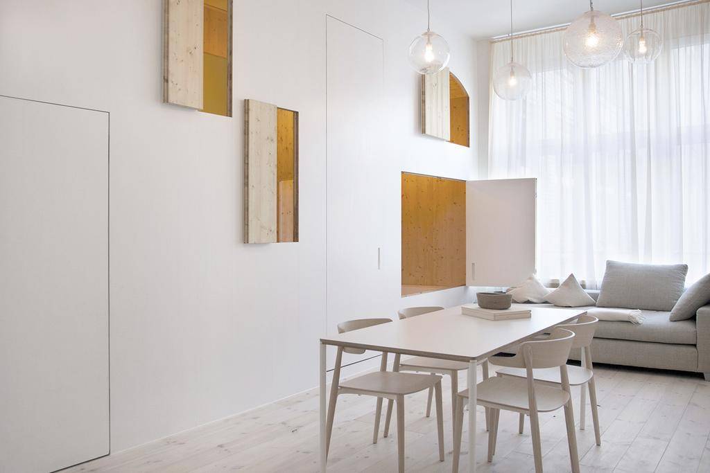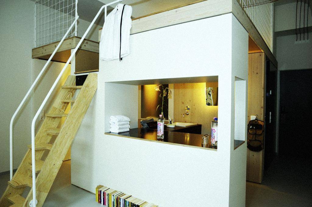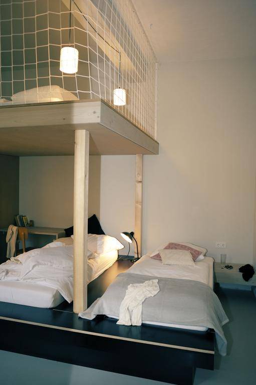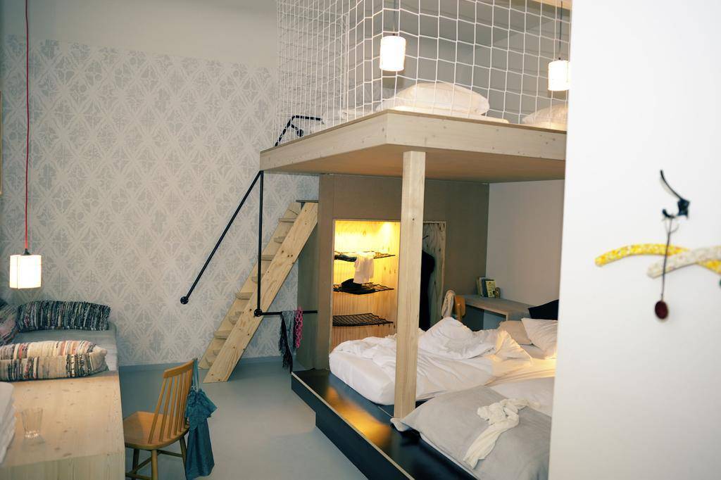 The Michelberger Hotel’s 119 guest rooms think outside of the box—big time. Their spare furniture is fashioned from unfinished wood, ropes and net. Wall-mounted flat-screen televisions are framed with raw wooden slats, and closets are comprised of “net” shelves. Beds in the loft-style triples are reached via a ladder.