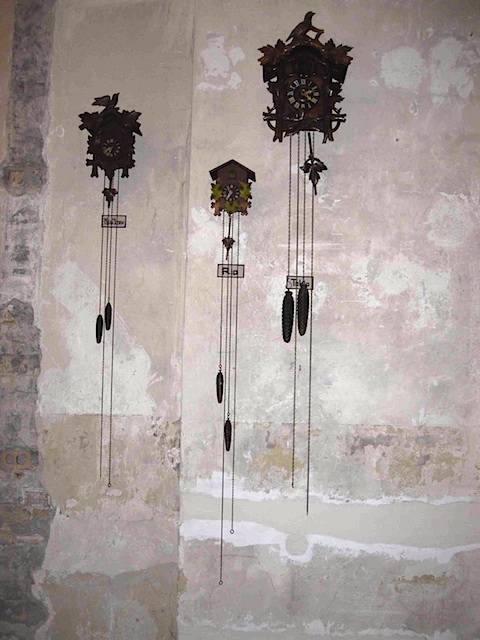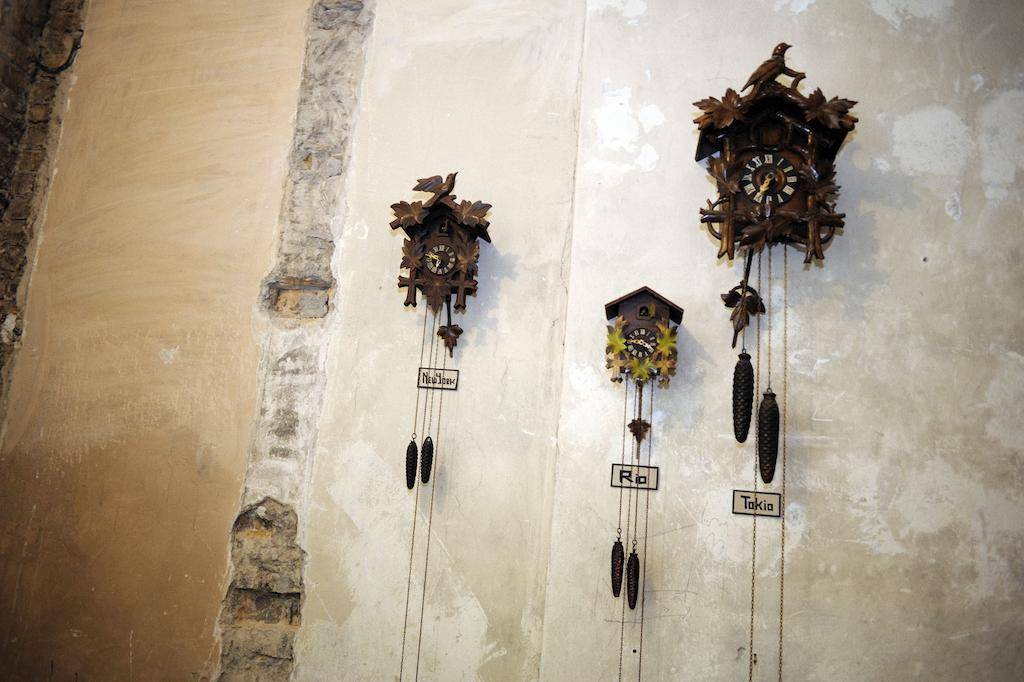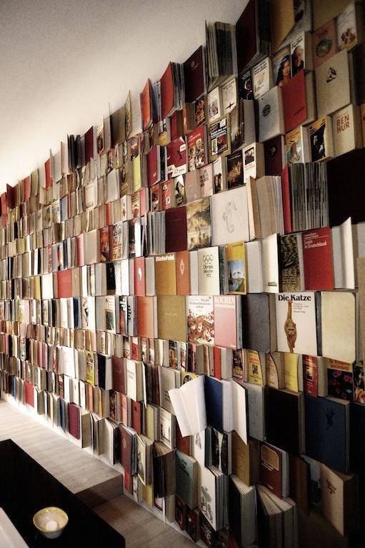 The Michelberger’s check-in area is actually more of a hang-out zone. A round retro desk, overseen by a friendly, young staff, floats in the middle of an open space shared with a self-service café and a whimsical lounge decorated with hundreds of used books. (Even the lampshades are made of books.) Like the rest of the hotel, including the hallways and stairwells, the lobby is only half-restored, with rough concrete walls. Our favorite detail here, however, is the row of cuckoo clocks set to different time zones.