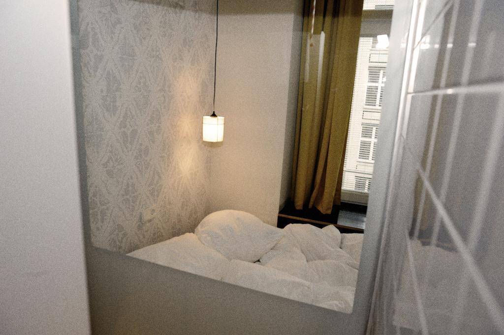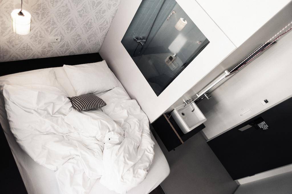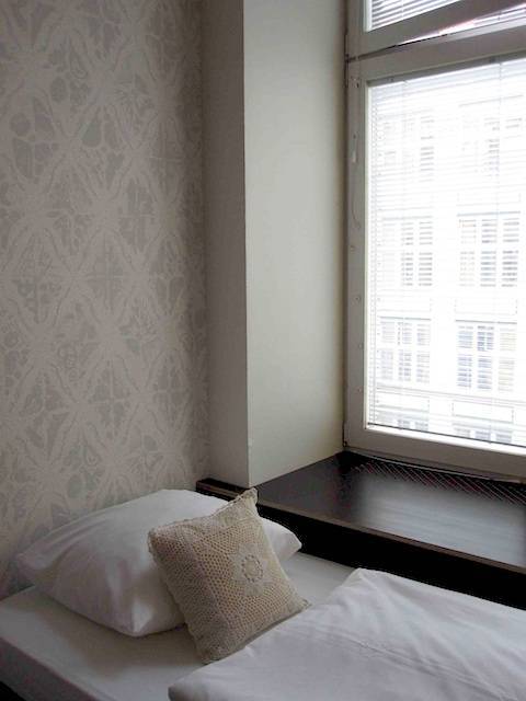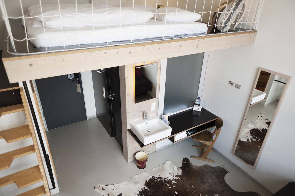 These inventive spaces struck us as fun and unusual, if a little awkward. (We’re not sure how we’d feel about sleeping in the loft bed, especially after one too many drinks.) Still, we loved the clean, unique décor, from cool light fixtures to the print wallpaper in some rooms.