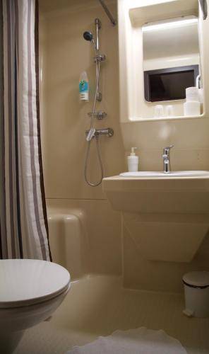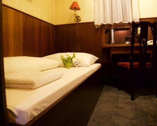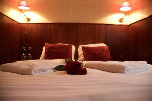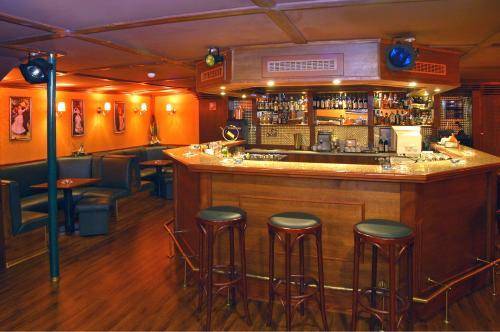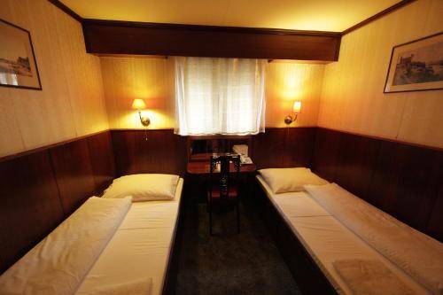 Its 32 rooms look like hastily designed staterooms, and the quarters are tight, as you might expect on a retrofitted boat. The walls are dark wood on the bottom half and mock-antique wallpaper on top. Little bedside lamps with red lampshades are mounted over the beds. Nice touches, such as mirrored desks, battle with less pleasing design elements, such as the upholstered faux-antique chairs. All rooms are equipped with air conditioning, television, phones and mini-bars. The bathrooms serve as another reminder that the hotel is on a boat: They're cramped and have a completely prefab pod-like construction.