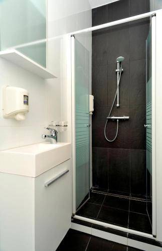 In lieu of toiletries, you’ll have an institutional soap dispenser in your shower. But, tiny as they may be, the shower and toilet in each room are clean and functional.