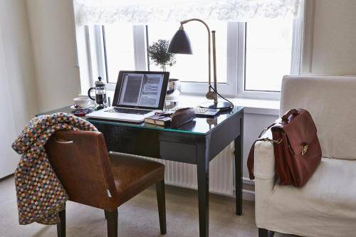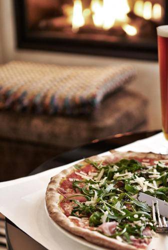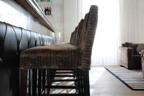 Downstairs, the mood is friendly and relaxed. The reception-bar is lined with mod overhead lights, and a cozy seating area boasts a fireplace, a mini-library, and a selection of board games.
