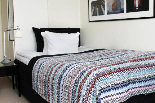 Upstairs, the 66 guestrooms blend the best of the minimalist Danish design aesthetic with foreign accents. Think white walls and carpeting, polished black furniture, and colorful Missoni print bedspreads. Rooms come in the "standard" and "A+" categories. A+ rooms are more spacious and boast a free minibar. Family rooms with four beds are also available. Bathrooms are fresh as can be and are done up in white tiles.