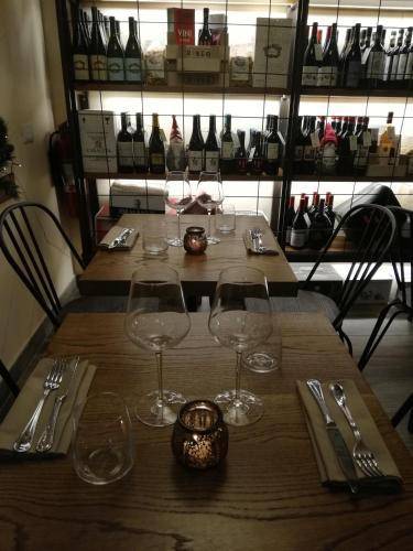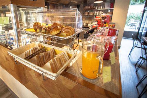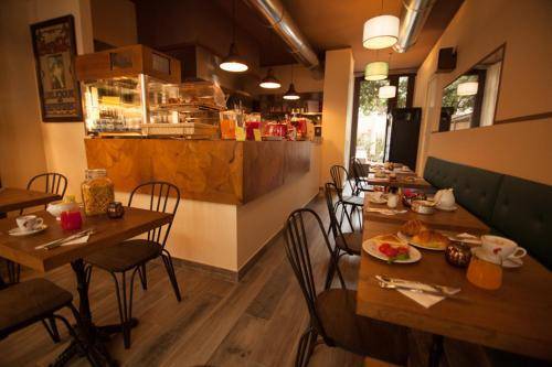 The breakfast room has café-style seating and a shiny white coffee bar. Breakfast is included.