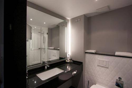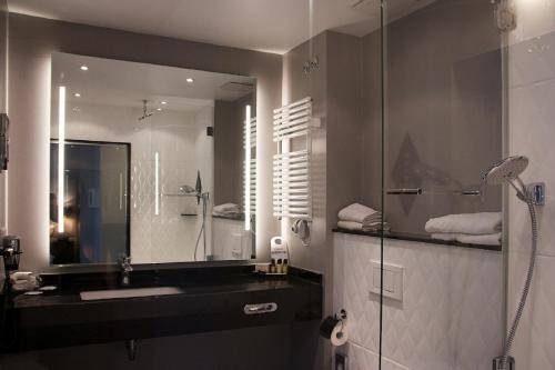 The black-and-white bathrooms are equally sleek, and equipped with a luxurious cascade showerhead and immaculate porcelain sink.