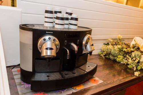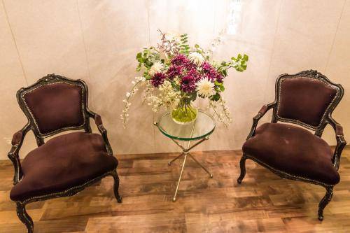 The reception area’s white walls are punctuated by bold artwork and complemented with black chairs, glass tables, and the occasional flower vase. This space also doubles as an open breakfast room, with upholstered dining chairs and a random mini-palm plant. Breakfast is sometimes included in the room rate, so check when booking.