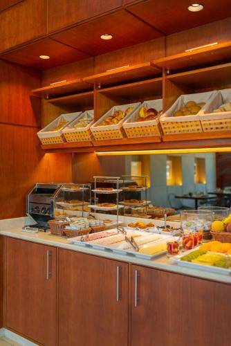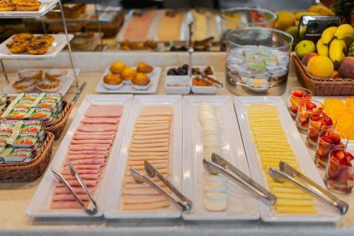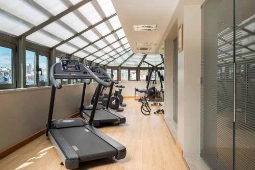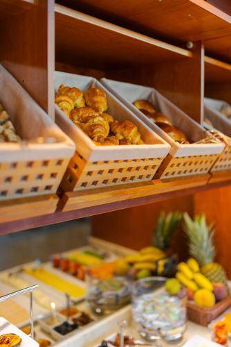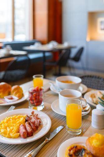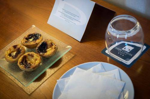 A complimentary fitness center on the eighth floor offers guests exercise bikes, treadmills, rooftop views and the chance to sweat it out while watching VH1. A full-scale “Dom Carlos” breakfast buffet (with eggs, cheeses and meats) is served in the lounge every morning and included in the nightly rate.