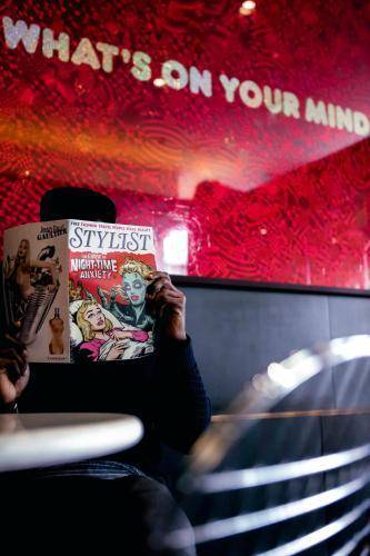 The rest of the space is decorated with interesting artworks, quirky lighting, and stacks of reading material.
