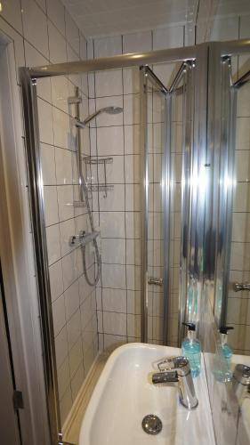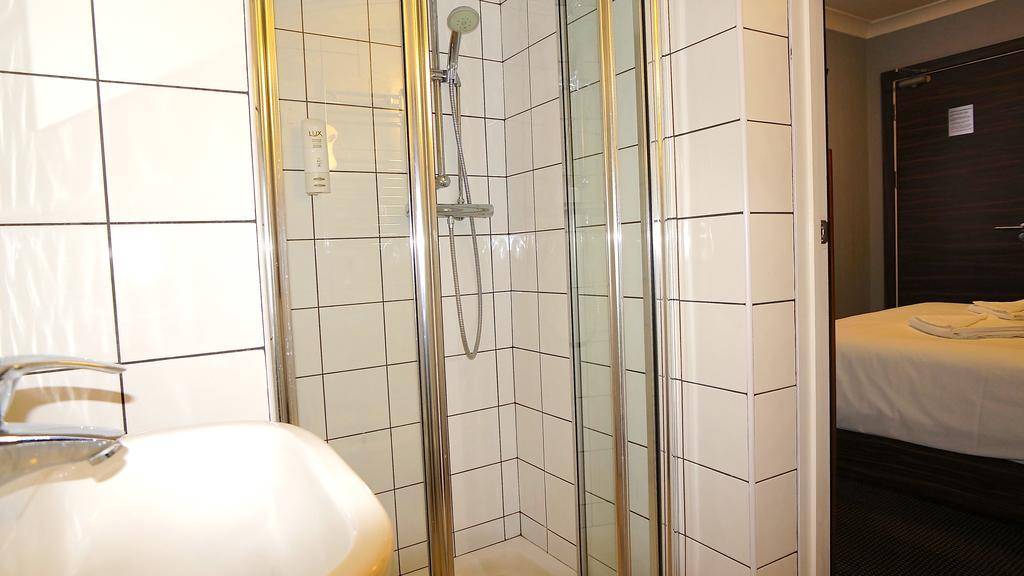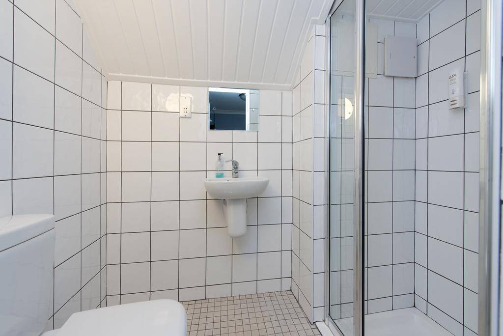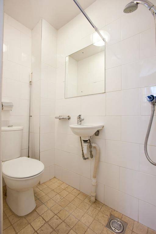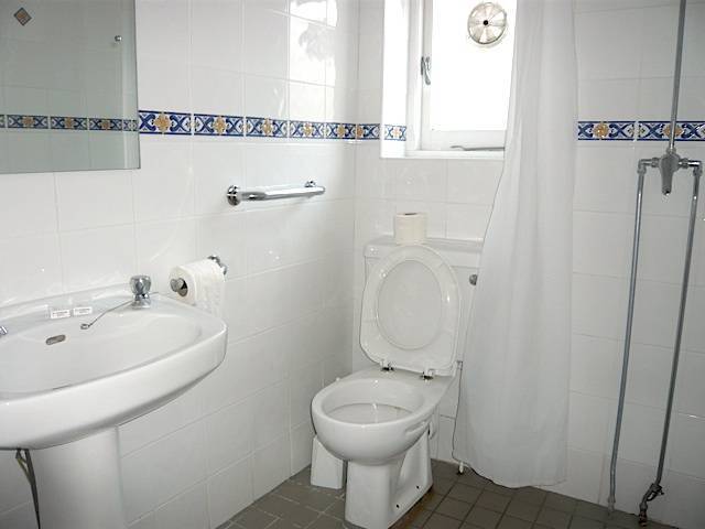 Note that the shower is set off by a curtain only (no wall barrier), so the floors can get quite wet.