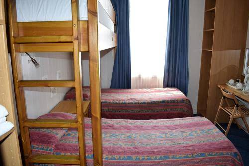 The small bedside tables and wardrobes are of the Ikea variety. Framed reproductions of well-known paintings adorn the walls. Front-facing rooms look out onto the lush park.