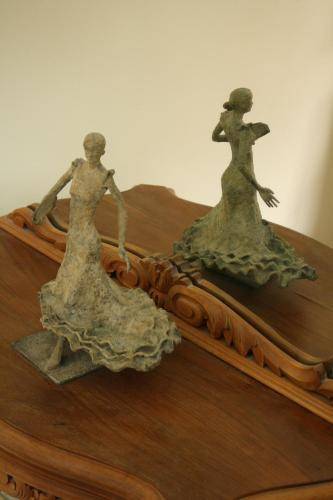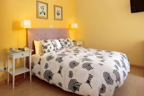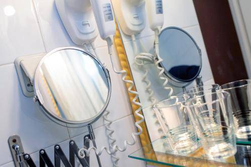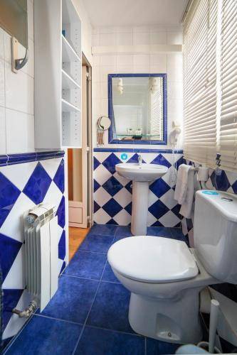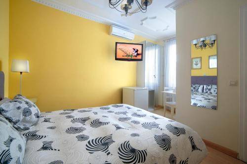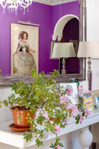 Hallways are bright and sunny with glass chandeliers, antique chairs, and original Madrileño modern art. We especially liked the decorative molding in each room. Beds are draped with sheer fabric, gilded vintage mirrors reflect shrouded walls, and new bedding looks like it was purchased yesterday from a mid-range suburban furniture store. The black-and-white room's bathroom amusingly features cow tiles.