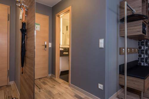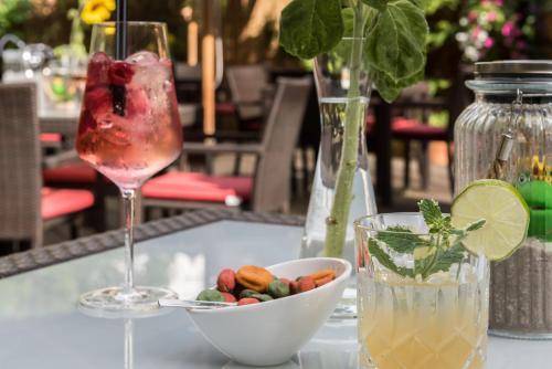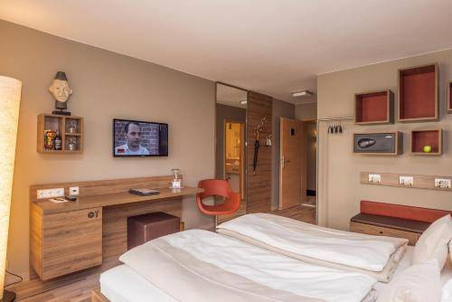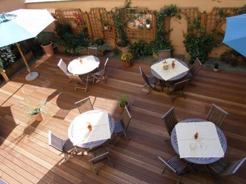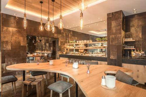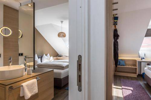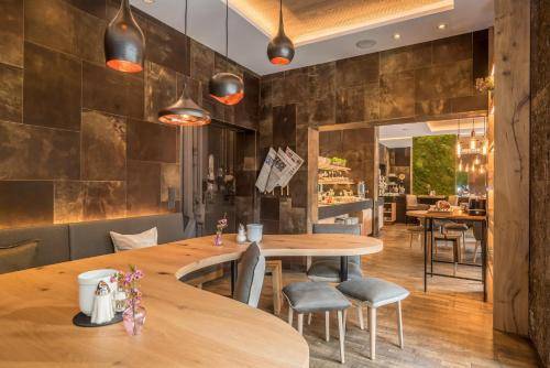 The chic vibe extends to the common areas. The courtyard terrace is decked out with big umbrellas and sleek lawn furniture. The hotel also boasts a swanky indoor bar, an office area with a free computer station, and an attractive breakfast area where a traditional Bavarian buffet is served.