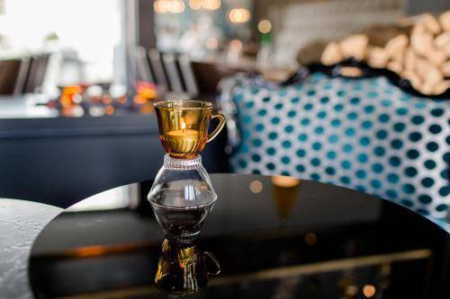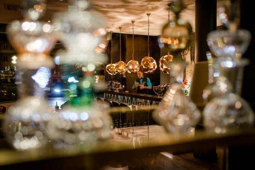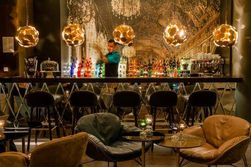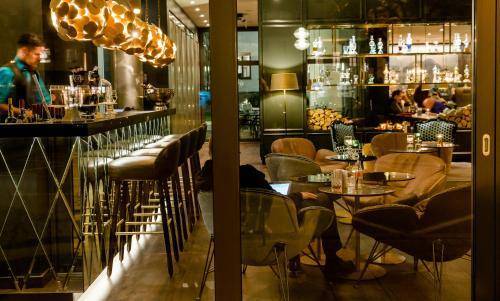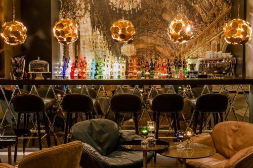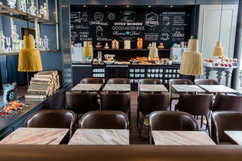Meanwhile, downstairs, the ground floor offers a large Munich-themed bar and cafe, which doubles as a busy breakfast area (a breakfast buffet is offered for an extra charge). Remixed lounge music floats through the space all afternoon as guests enjoy coffee or cocktails.