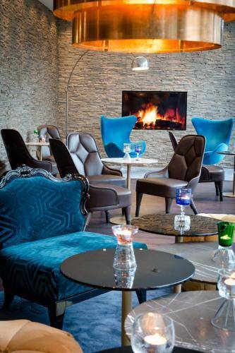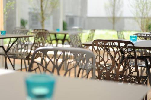 As for the hotel’s 241 rooms, they’re trendy little things, dressed up in the hotel’s ubiquitous teal-and-black color scheme, and equipped with air conditioning, free Wi-Fi, flat-screen TV (showing, upon entry, a roaring fireplace in winter or an aquarium in summer), and a small desk and chair. Rooms either look out to the relatively calm street or onto a back garden.