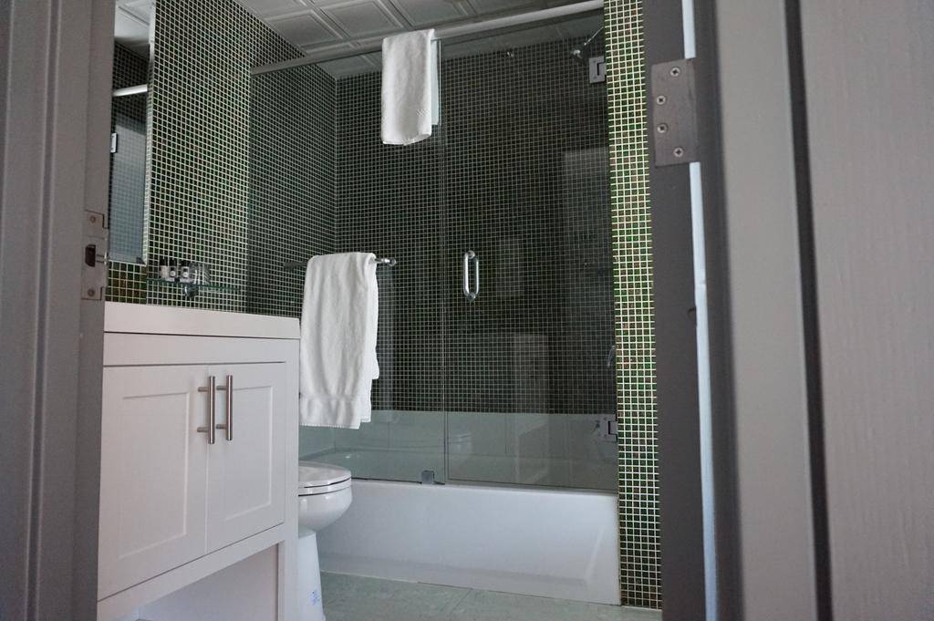 Bathrooms are standout smart, with walls tiled in beautiful little green squares of stone or white subway tile, sheer glass shower doors and little towel toiletry bags.
