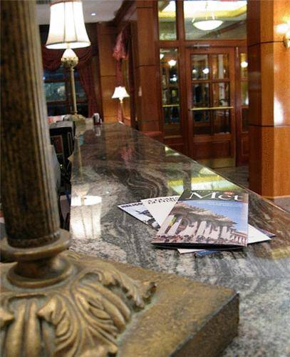 Note that there’s a nice lounge in the back of the hotel, done up with sofas, chairs and books lining the built-in shelves.The lobby has an old-fashioned European air, with green marble floors, antique-looking armchairs and framed oil paintings.