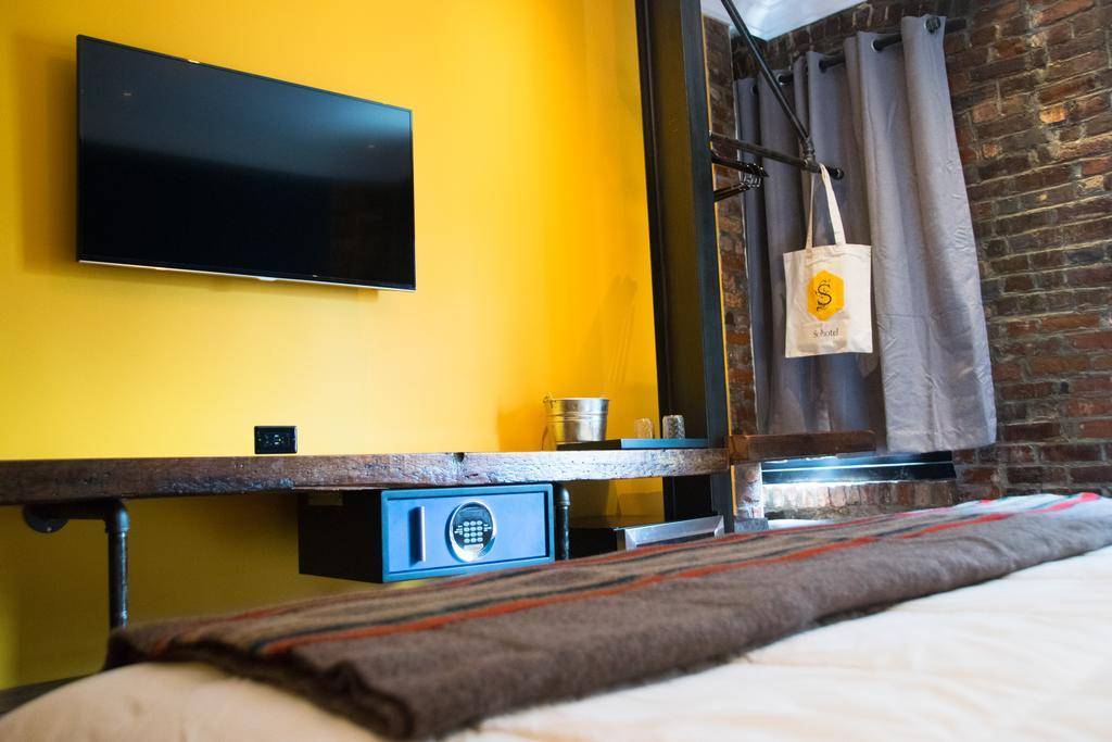 Rooms, spread out over four floors, repeat the lobby's exposed brick motif. Walls are a vibrant yellow and hold large flat-panel televisions, while tall dark wood chests of drawers sit on hardwood floors. Beds sport thirteen-inch thick Therapedic mattresses and are topped with quilted duvets.
