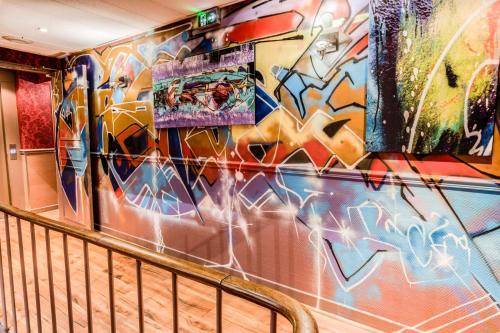 Decked out with a flat-screen television, party-hat-shaped lights, exposed brick walls, vending machines and what must surely be one of the world’s largest clocks, the lobby buzzes with activity. The staff is equally happy and helpful.