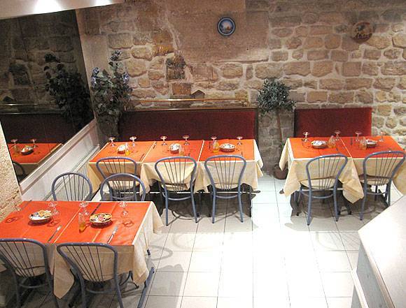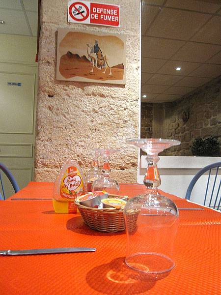 Breakfast is served in a cave-like basement dining room for €13, and includes croissants, baguettes, cheeses, jams, coffee/tea and juices.