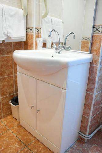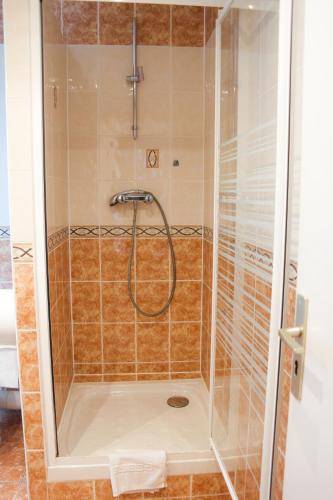 All rooms have a nicely tiled private bath, each of which has a shower (no bathtubs) and a hair dryer.
