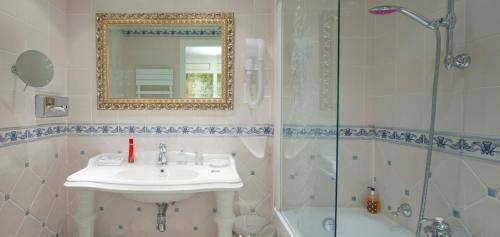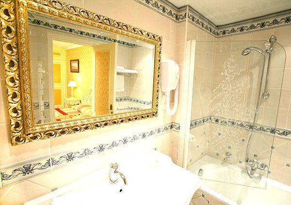 Offering an exquisite selection of toiletries, the bathrooms dazzle with spotlights, white-and-blue tiling, sizable marble sinks and ornate gold mirrors. Bathtubs are available (request ahead).