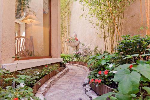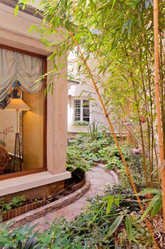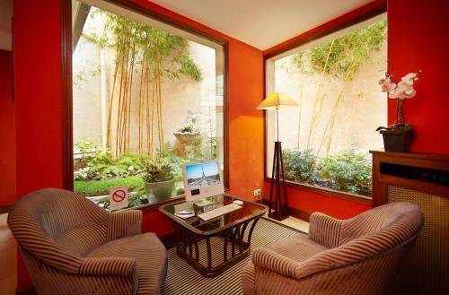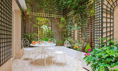 The quietest rooms overlook a flower-filled inner courtyard, while others look out onto the street, with double-paned glass to keep the noise down. The deluxe suite, located on the ground floor, has its own private patio terrace and spacious seating area.