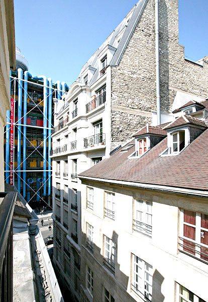 The Hotel Beaubourg sits on the tiny rue Simon le Franc, less than a half-block from the back of the Pompidou Center. This location puts you close to the Les Halles RER stop (direct to Charles de Gaulle airport), and close to innumerable other Right Bank attractions. The restaurants, shops, and bars of the Marais are minutes from the hotel.