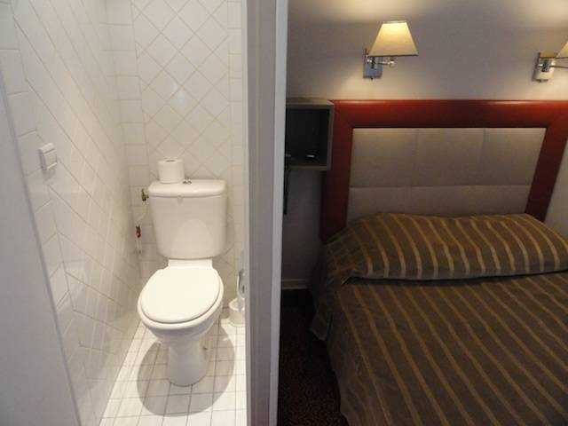 About those private baths: in some of the rooms, the facilities are split, with the shower and sink together, and the toilet in its own tiny room. This isn’t really unusual, but the toilets can be awfully tight and feel a bit wedged in next to the bed (see photo).