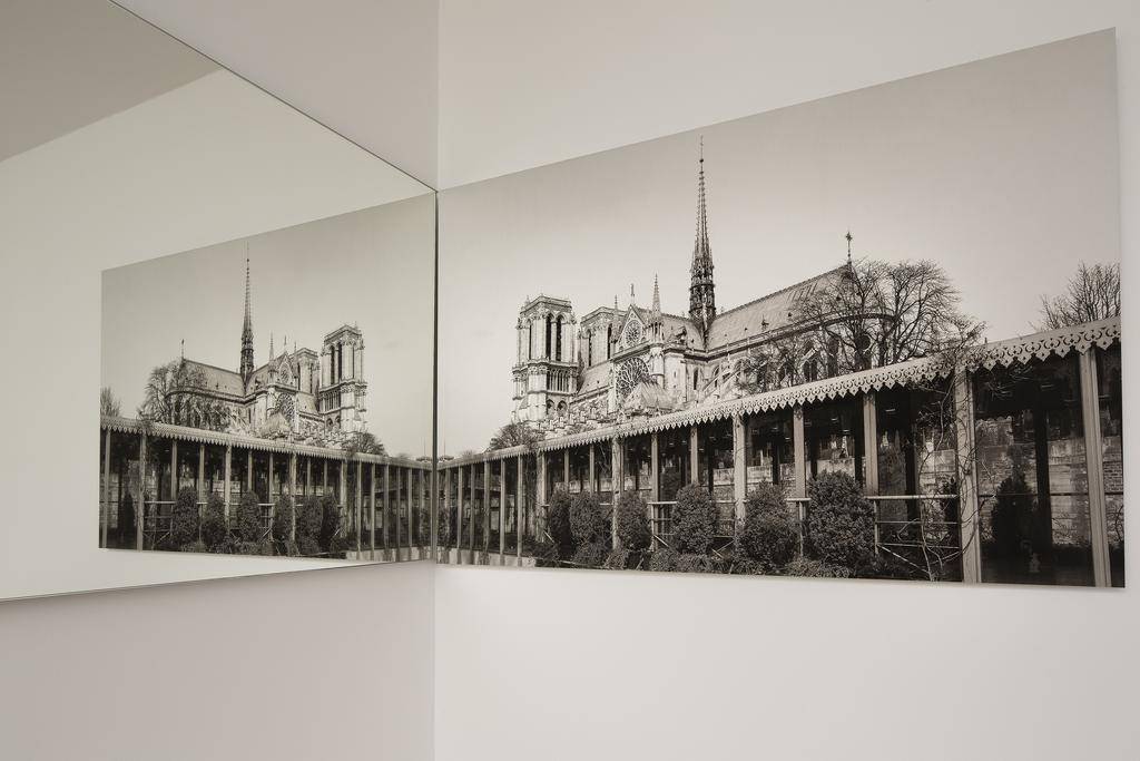 Interestingly, each room sports its own photo optical illusion—a photo and mirror set installed into the corner that provides a playful (and fictional) view of a famous Paris sight.