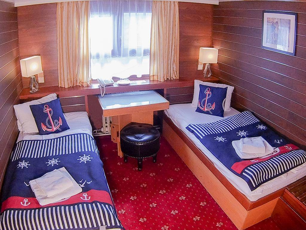 Space is at a premium on the boat, so the hallways are narrow and the 86 guestrooms are small. However, rooms are nicely decorated and furnished with a small TV, a luggage rack, and a tiny table. Bathrooms are just big enough for one person, but colorful tiles and sailboat-themed shower curtains add a nice touch.