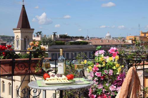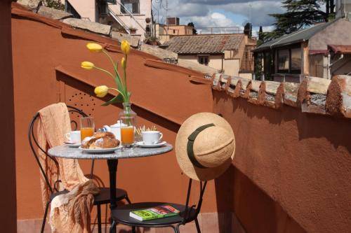 All rooms are equipped with air conditioning, a mini-fridge, TV and soundproof windows. A few have balconies with views of St. Peter’s and Piazza Venezia (ask ahead). All bathrooms are private and come with toiletries and a hair dryer.