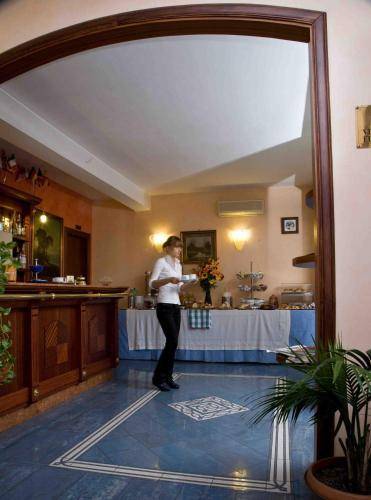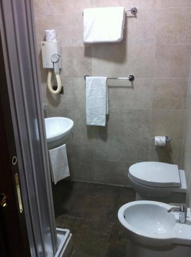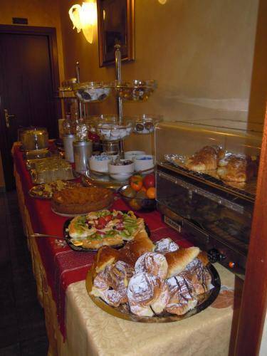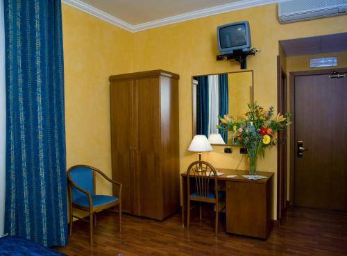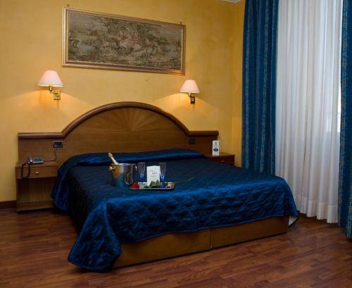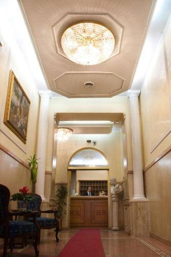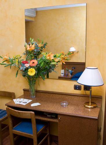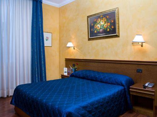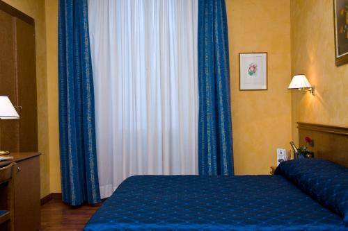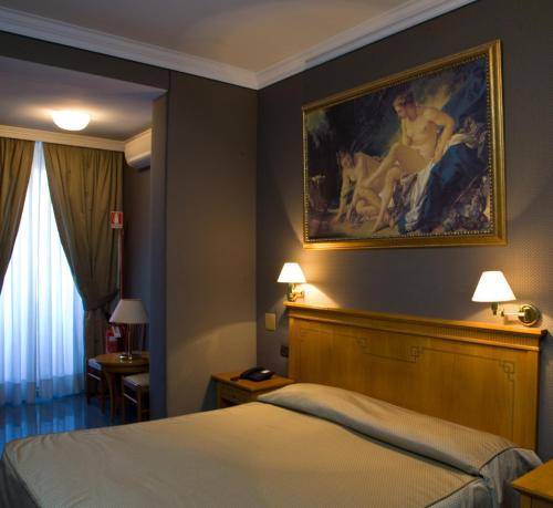 It's located just across the street from the main exit of the massive Termini Station. You can hop off the train, drop your bags at this reasonably priced hotel, and be out again in no time at all. Many of the 37 rooms have been recently updated and sport white walls, plain bedding, and striped headboards. The remaining rooms are a bit dated but still comfortable, with wallpaper, high ceilings, and marble or hardwood floors. Amenities include air conditioning, a television, phone, and minibar.