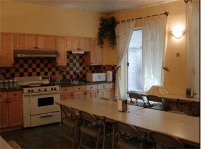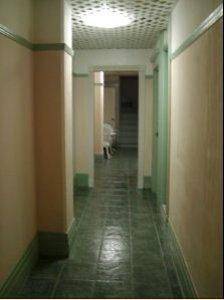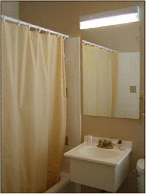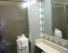 Bathrooms are spic-and-span and tiled in gray and white. Some rooms have private bathrooms while the real bargain rooms share.