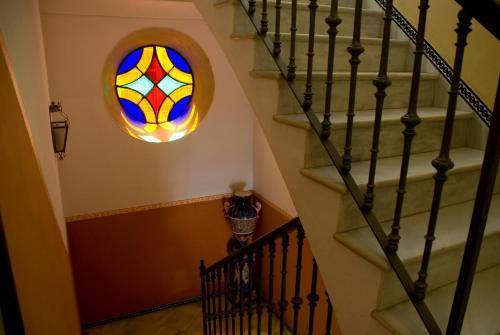 Stained glass brightens the foyer, stairwells and hallways. The Abril also offers assorted seating areas and a bright interior patio filled with plants and wicker furniture.