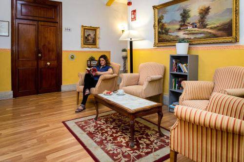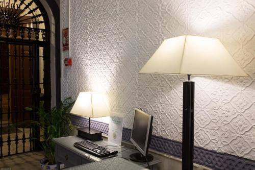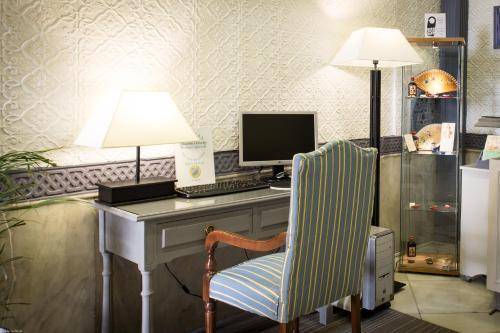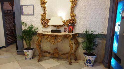 Little extras like marble tables and brass mirrors delight, and stained-glass interior windows add color and class. A gift cabinet in the lobby displays fans, flamenco dancer figurines and small guitars.
