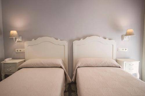 A grand tiled staircase leads up to the guestrooms, which are simply decorated with white headboards and white or blue bedspreads. Each room is equipped with air conditioning, soundproof windows, a flat-screen TV, safe and radio. Some rooms have small balconies, while others have windows out to the adjacent alley.