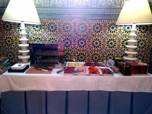 The Simon’s 40 guestrooms have double-paned windows, marble floors and solid furnishings. Desks and nightstands are wooden, and red fabric headboards add a bit of color. There is no air conditioning or television here, but with all the action outside we didn’t notice. (When we visited a few weeks before Easter, orange trees were in bloom, men practiced for Semana Santa and women danced flamenco danced down the street.) Some rooms have small balconies overlooking Garcia de Vinuesa.