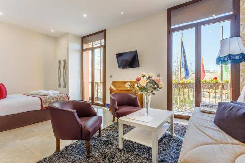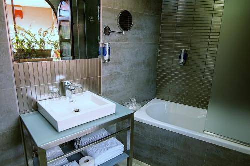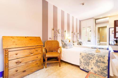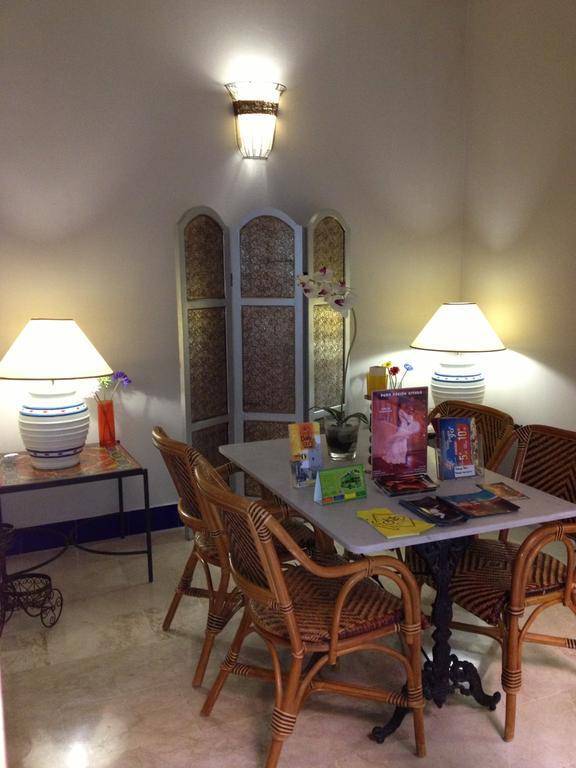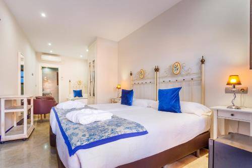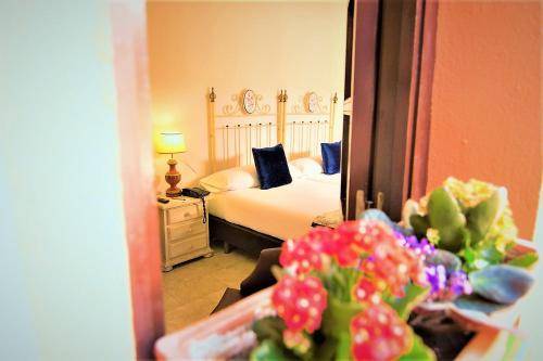 The hotel’s 39 rooms are tastefully furnished with wrought iron beds and wooden secretary dressers. Arched windows overlook the hotel’s interior patios, which are filled with natural light (note that there are no windows that face outside). Each room is equipped with air conditioning, a flat-screen TV, safe and minibar.