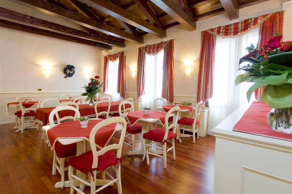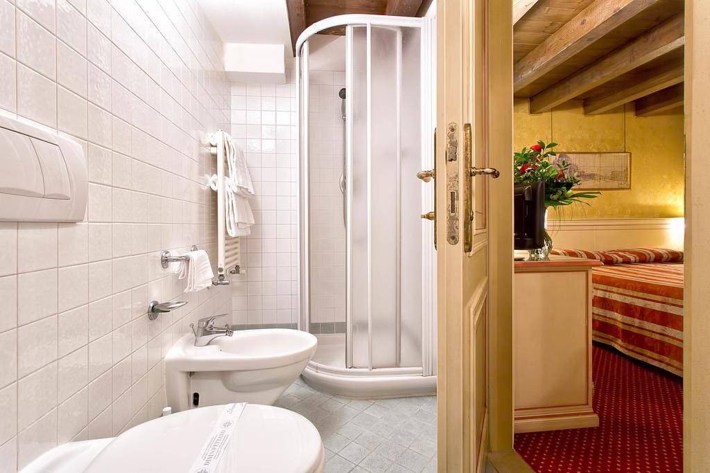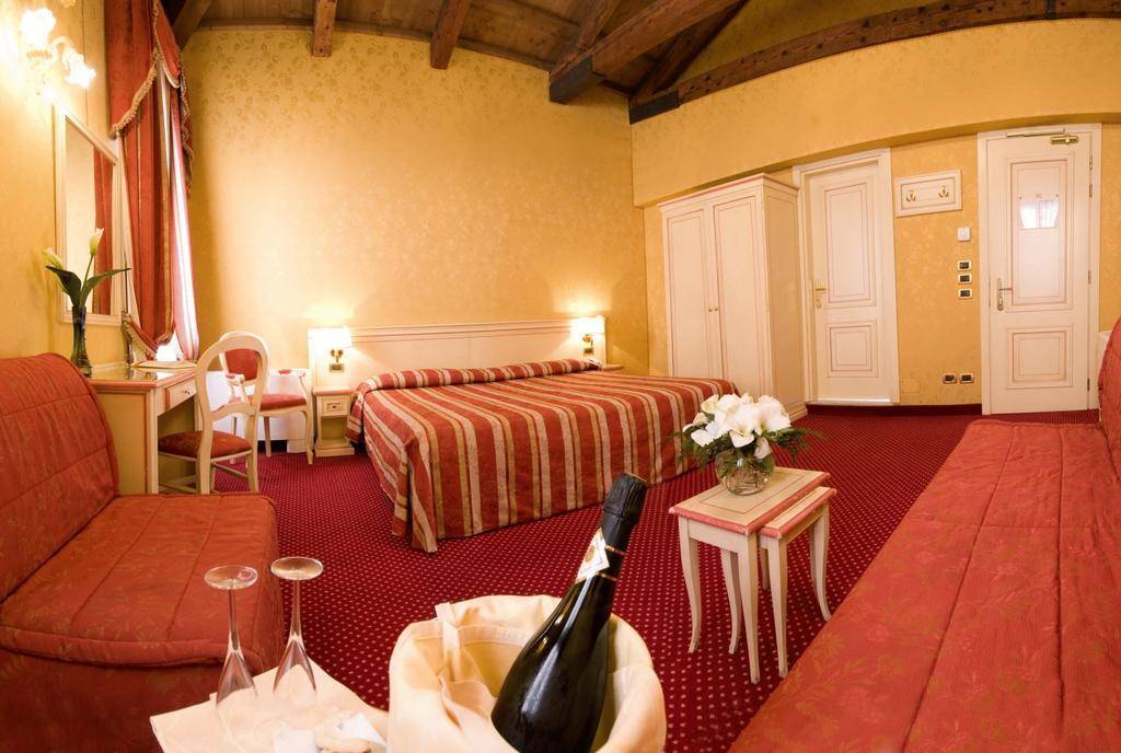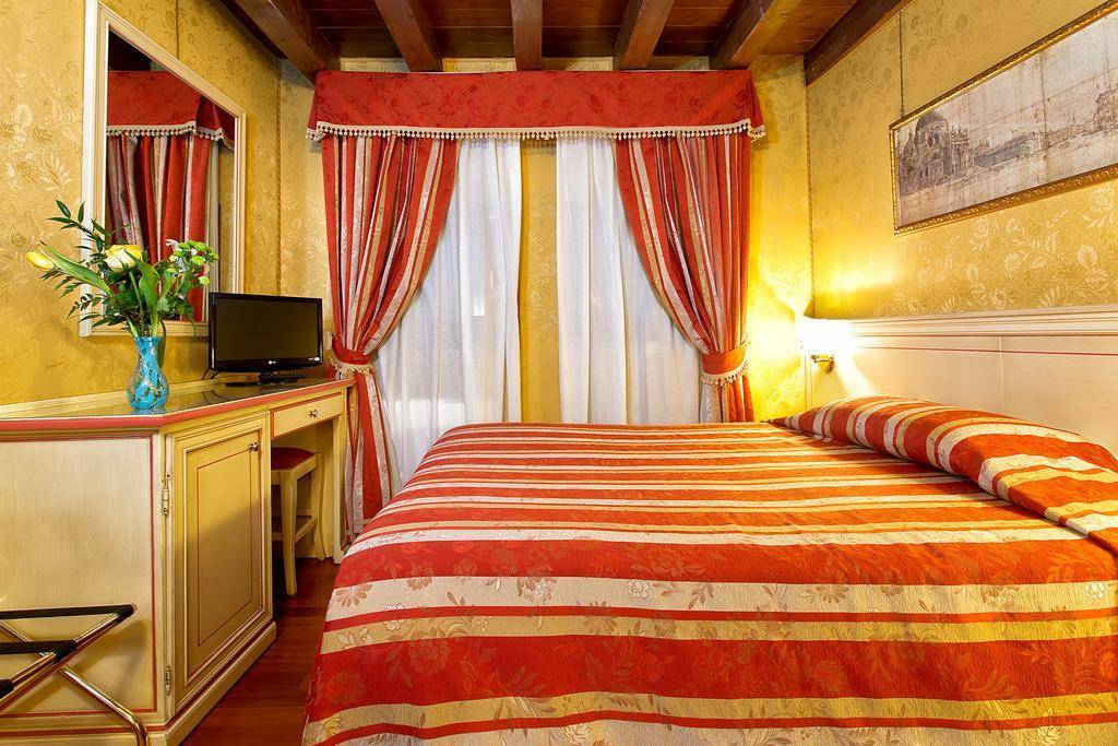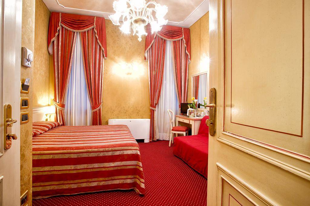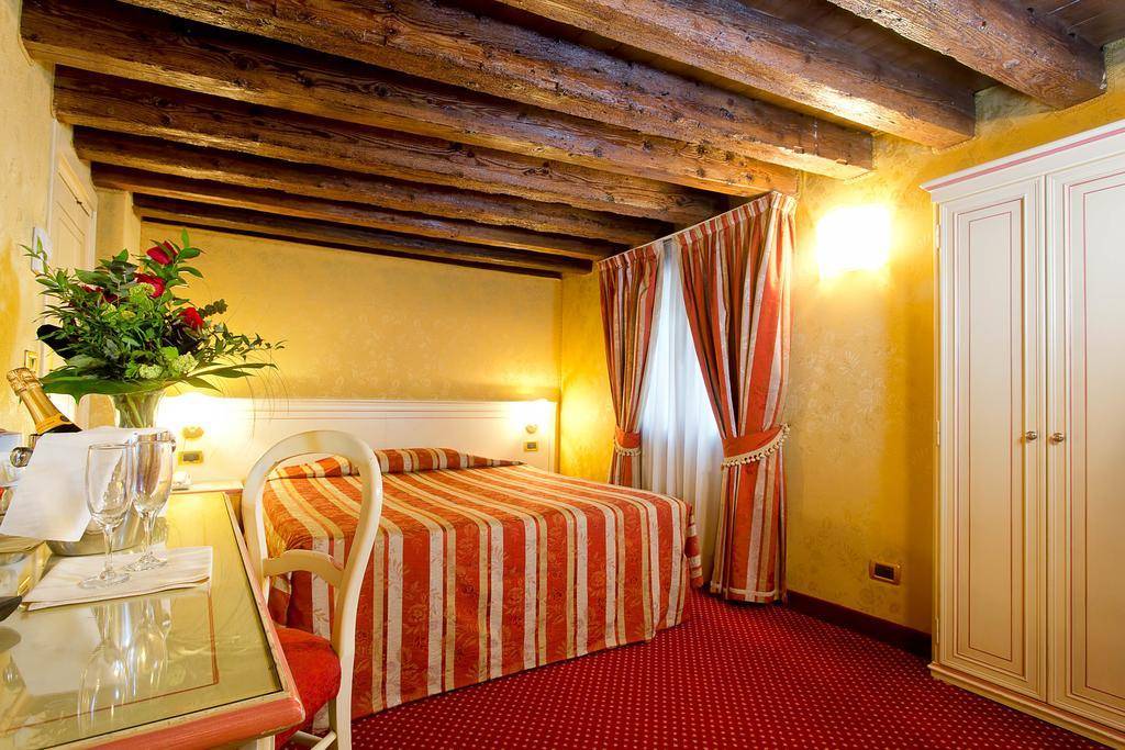 The 16 guest rooms at the Ca’ San Polo range from dollhouse-like doubles to family rooms that sleep up to five. Regardless of square meters, each room is done up with full Venetian style, red and gold down to the last stitch. Wooden beams cross the ceilings in every room, and all rooms offer air conditioning, a TV, minibar, and phone.