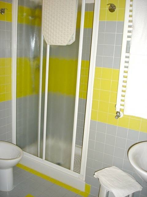 Spruced up private bathrooms sport attractive yellow-and-gray tiling, a shower, hairdryer and toiletries.